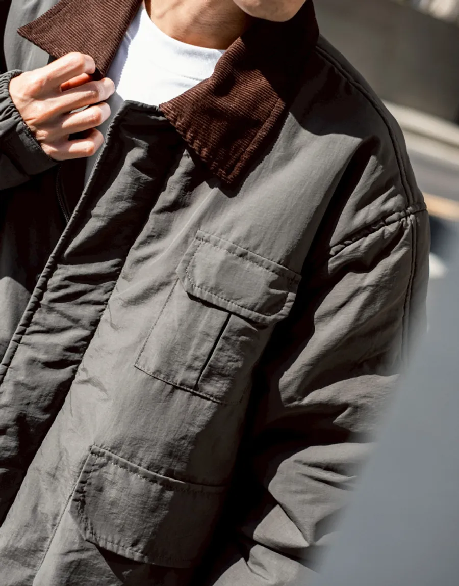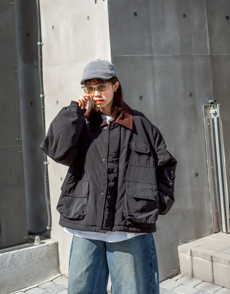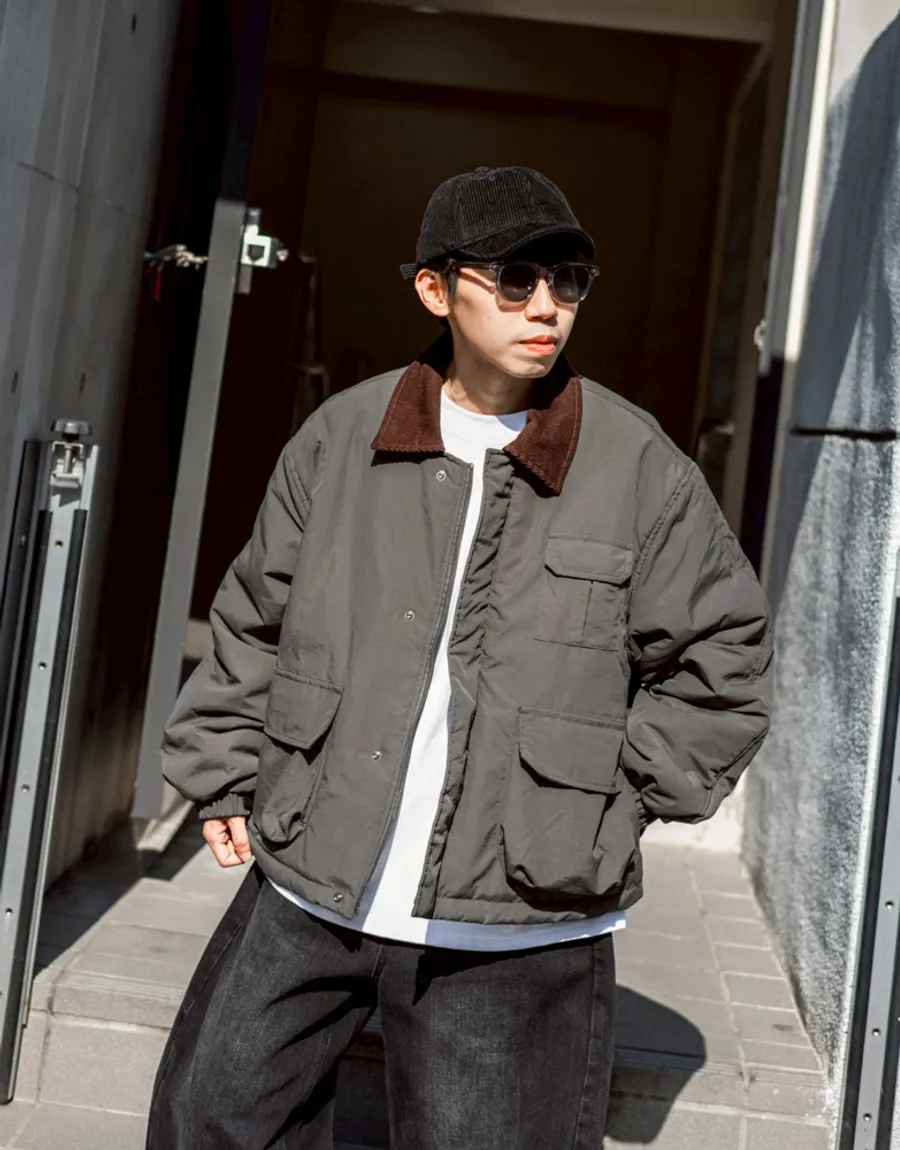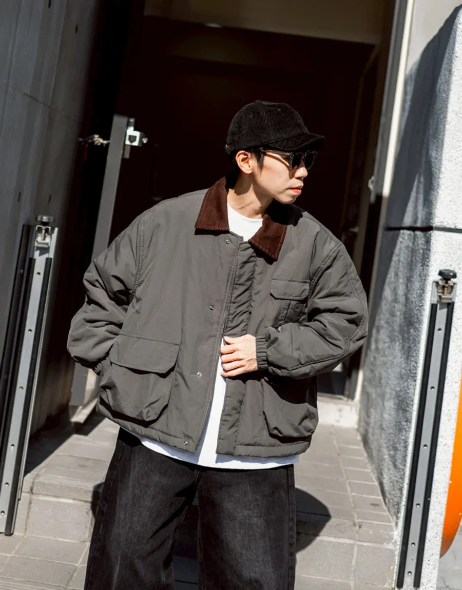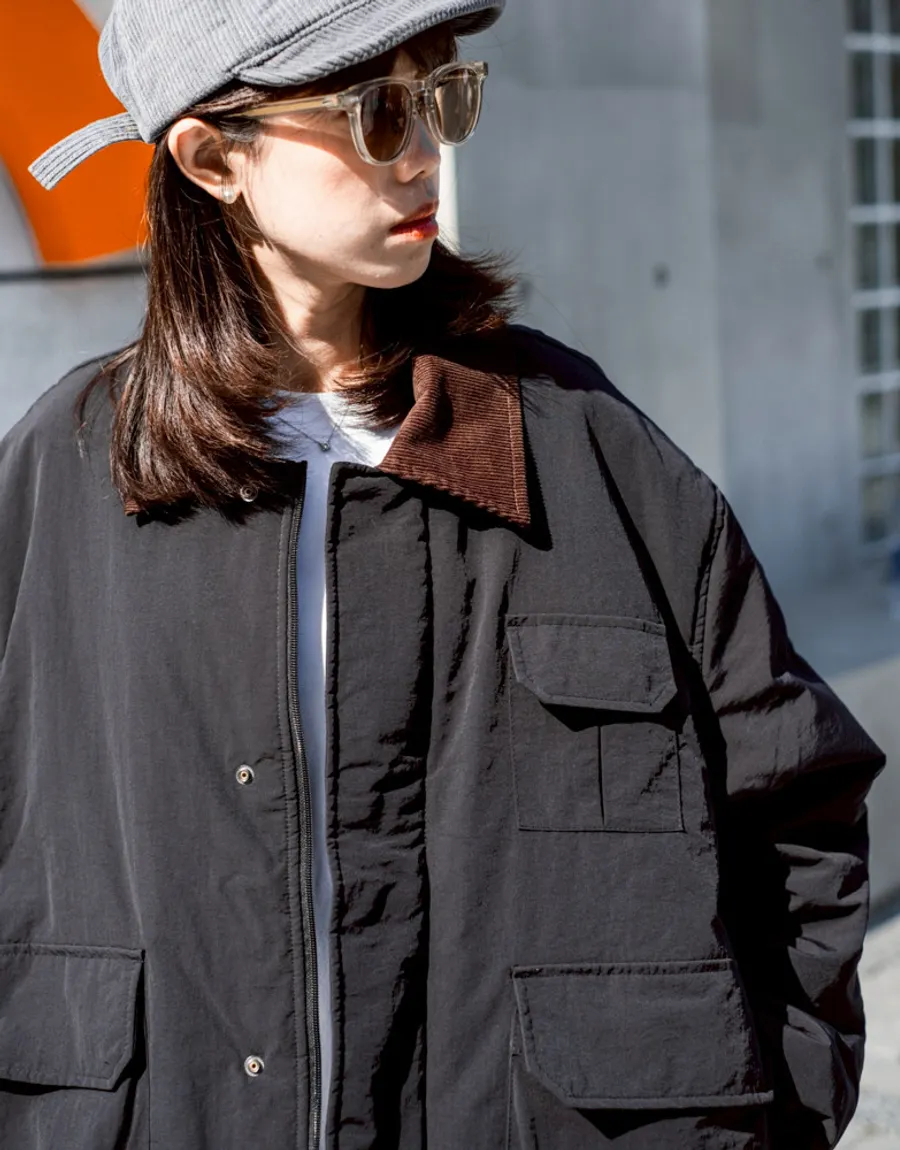 領口使用燈芯絨裁片拼接 細膩紋理與主布料形成對比