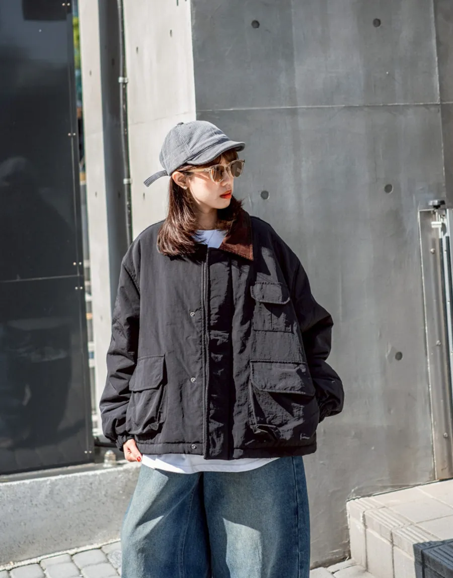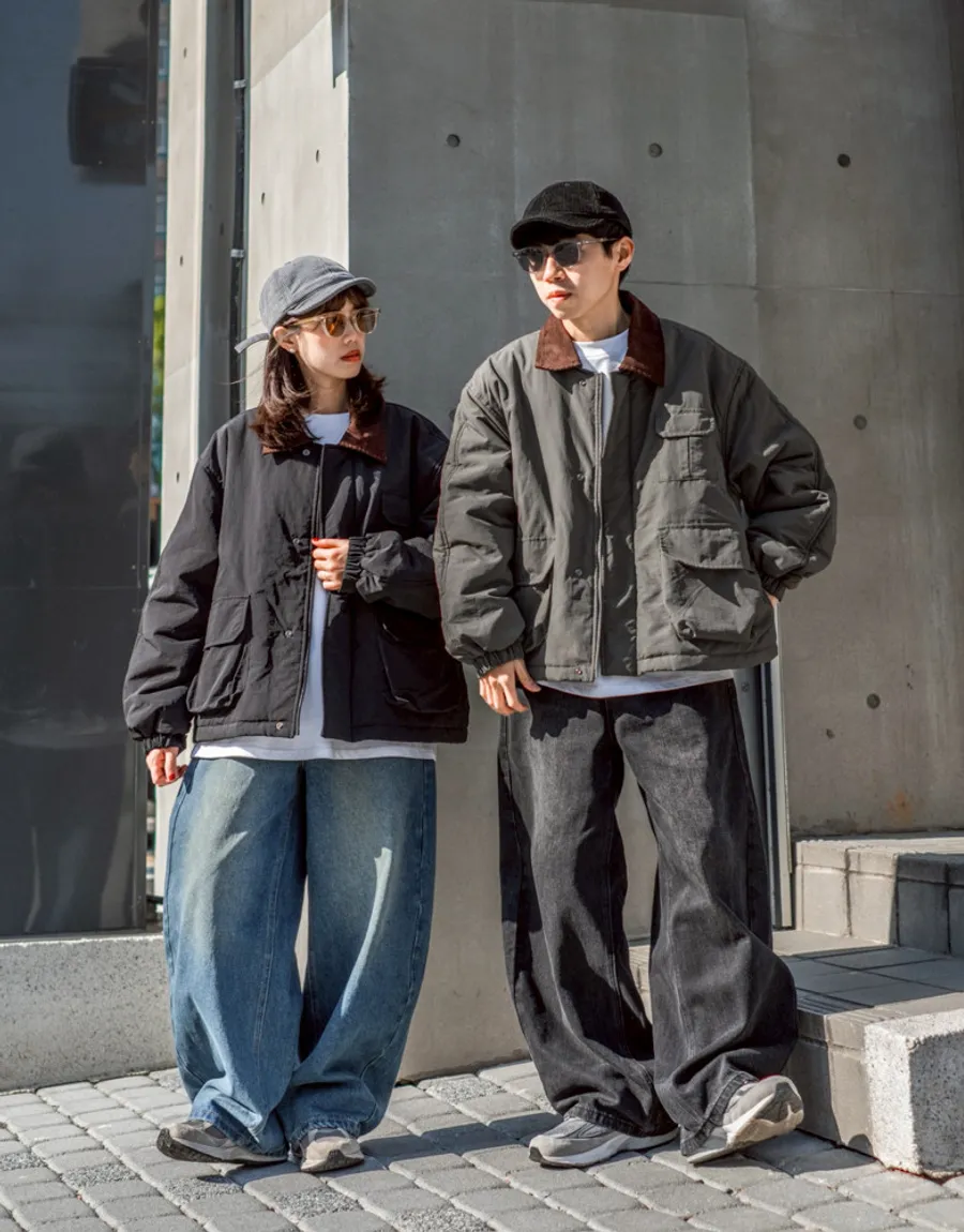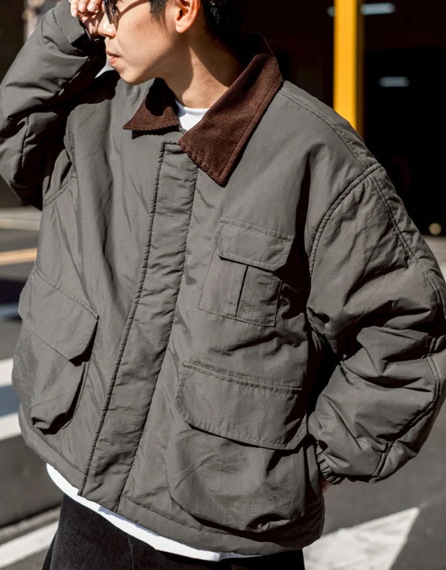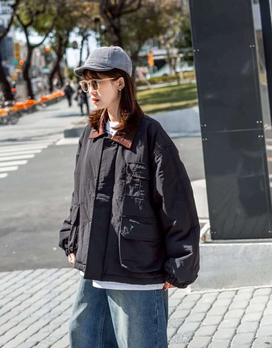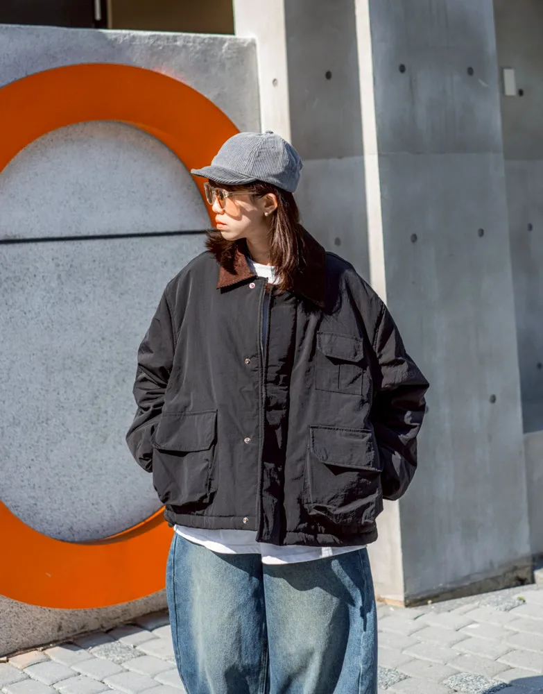 領口使用燈芯絨裁片拼接 細膩紋理與主布料形成對比